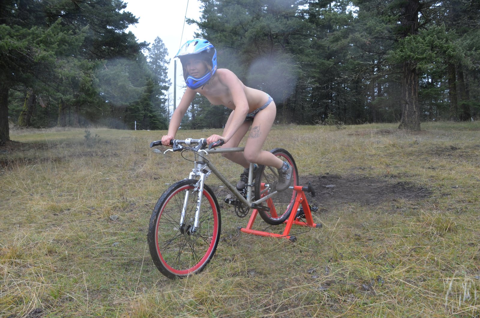 So- [9spd x 3= 27] x 2 up front = a total of 54 gears! Sure, tons of overlap.. but it’s the top end I’m looking for. And this lass posed with an early itteration of The Bike.. the Suburbinator.. in the rain!